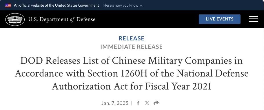“1260H清单”是美国国防部根据NDAA 2021第1260H章节发布的中国军事企业(CMC)清单。该章节授权美国国防部长根据最新可用信息识别确定直接或间接在美国或其任何领土和属地运营的中国军事企业及直接或间接在美国运营的军民融合贡献者(Military-civil Fusion Contributor,MFC)。《2025财年国防授权法》(NDAA 2025)第1346节对1260H节作出了进一步修订。